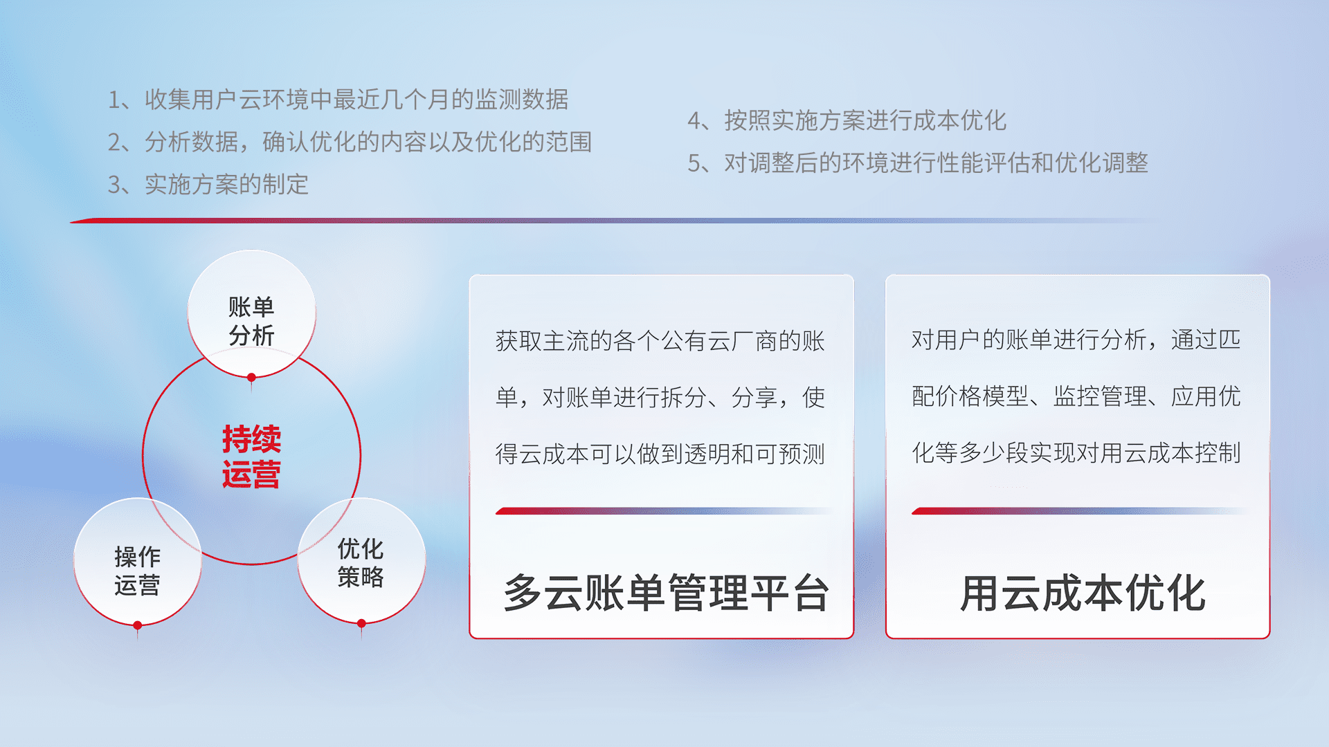 通过多云纳管,,,,以统一的资源数据模型把客户的云资源进行抽象和封装,,,进而实现对多云资源的统一操作,,保障云资源管理的可靠性、、稳定性与可用性。。量身定制化运维内容,,,,配置、、、开发运维、、补丁管理、、、备份、、监控、、、认证和访问管理、、、审计和日常巡检等,,保障在用云过程中的可靠度,,稳定度以及高可用率。。。。